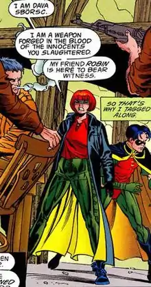 Dava is a fictional character in the DC Comics universe. She is a martial artist created by writer Chuck Dixon and artist Staz Johnson, and she first appeared in Robin #49 (1998).[1]