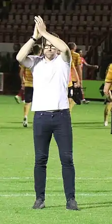 On 8 January 2017, Artell was appointed as Crewe Alexandra's first team manager, replacing Steve Davis.[51][52] One of his first moves was to appoint another ex-Crewe player and former Bala teammate Kenny Lunt as assistant manager.[53] With his side facing the possibility of relegation out of EFL League Two after a 4–0 defeat at Hartlepool United on 28 February, Artell warned his players that "relegation means oblivion... they'll end up in the Conference North on £200 a week with a job as a milkman."[54] Crewe promptly won four of their next five games in March to move towards mid-table safety,[55] a team performance that helped earn Artell a nomination for EFL League Two Manager of the Month.[56][57] The "Railwaymen" ended the 2016–17 campaign in 17th place, and Artell released six players in the summer.[58] He warned the remaining out-of-contract players to sign their new contracts quickly before he withdrew their offers, but said "we all had a say. It's not a dictatorship. I'm not Idi Amin or Pol Pot... it's evolution, not revolution, but we won't be happy with 17th in the table again next season".[59][58]