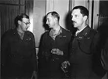 ![]() (From left to right) Brigadier E. T. Williams, Lieutenant-Colonel L. M. Murphy and Brigadier R. F. K. Belchem at the second anniversary of the Battle of El Alamein dinner on 26 October 1944 | |