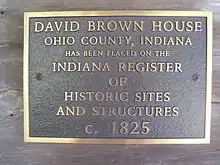 The David Brown House (constructed circa 1825) is located 4 miles (6.4 km) north of Rising Sun, Indiana and approximately 3 miles (4.8 km) south of Laughery Creek. The log home was placed on the Indiana Register of Historic Sites and Structures on October 25, 1978.