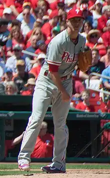 He began his professional career in 2010 as a member of the Williamsport Crosscutters, with whom he started 13 games, losing only one of them, and recording a 4.21 earned run average (ERA). At the conclusion of the season, he played in the Florida Instructional League.[2] He progressed to the Class A and Class A-Advanced level in 2011, pitching for both the Lakewood BlueClaws and the Clearwater Threshers, and combining to post a 3.49 ERA in 26 starts.[5] He finished third in the South Atlantic League (with Lakewood) by posting 11 wins, and finished seventh with a 3.38 ERA.[2] His steady advancement through the minor league system continued in 2012; the next year, he spent a full season with the Reading Fightin Phils of Class AA.[5] Despite his fast ascent through the minor league system, he flew "under the radar" with Reading, despite a 3.86 ERA.[6] However, his season ended in June when the Phillies placed him on the disabled list due to a ligament injury in his middle finger.[2]