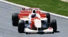 For 1996, Coulthard partnered experienced driver Mika Häkkinen at McLaren, and believed there was a chance of winning races, though a challenge for the World Championship was unlikely until 1997 or 1998.[28] His season started badly; he suffered a throttle issue in Australia, including a collision with Jordan driver Martin Brundle on the first lap. Coulthard spun off in Brazil and finished outside the points in Argentina. However, Coulthard secured a podium at the Nürburgring and led the race in San Marino before suffering a hydraulic failure.[23]