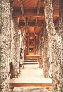 Sellers architectural style reflects a commitment to bringing outside materials indoors and remaining true to the natural beauty of the surroundings. For an elegant design solution, Sellers says, "Don't use rocks if you don't have rocks on your site. Use what meets the main criteria for value, which is based on perceived appropriateness for the site." By doing so, you support the local craftspeople who are familiar and adept at working with the native materials. In one of his designs, the Tree House, about one-third of the vertical supports are trees that were originally located on the property. The strength is preserved because they are in full shape without any cuts, usually without stain or bark removal.[16]