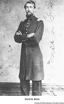 David Enoch Beem (June 24, 1837 – October 23, 1923) was a prominent lawyer, banker, and American Civil War veteran from Spencer, Owen County, Indiana. Beem, who attained the rank of captain of Company H, 14th Indiana Infantry Regiment, fought in numerous battles in the eastern United States before he mustered out of the Union army in June 1864. After the war Beem resumed his law practice in Spencer and became involved in local banking ventures. He was also active the state's Republican Party and civic affairs. Beem, a graduate of Indiana University, class of 1860, served on Purdue University's board of trustees for eighteen years. He also participated in the Grand Army of the Republic at local and state levels. Beem's papers and letters are preserved in the collections of the Indiana Historical Society in Indianapolis. The David Enoch Beem House, his former residence in Spencer, is listed on the National Register of Historic Places.