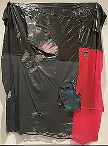 At a 2011 show at L & M Arts, he presented a number of drawings and painting obscured or cover by tarpaulins or plastic sheets - in one case being covered by a wooden armoire.[37] He has made drawings of Kool-Aid powder before covering them with a curtain; the curtain only being lifted under certain conditions.[37] These pieces reflect the idea that in an age of surveillance and information overflow, Hammons attempts to stem this flow and withhold information.[37] This idea was also seen more literally in his Concerto in Black and Blue where the Ace Gallery in New York was cast in pitch darkness and visitors had to guide themselves with little flashlights.[37]