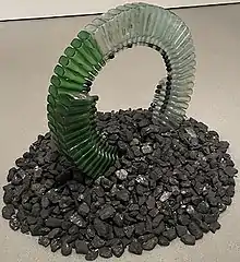 Later in his career, Hammons has explored the sculptural medium in creating pieces. In his 1970's Spade series included works such as Bird (1973) where the jazz musician Charlie Parker is evoked by a spade emerging from the mouthpiece of a saxophone. The name of the piece reflecting Parker's nickname of "Yardbird" or "Bird".[20] Similarly, there is Spade with Chains (1973), where the artist employs the provocative, derogatory term, coupled with the literal gardening instrument, in order to make a visual pun between the blade of a shovel and an African mask, and a contemporary statement about the issues of bondage and resistance. In his seminal piece, African-American Flag Hammons tackles the topic head-on. The piece depicts the American Flag in the Garvey Colours of Black, Red and Green (Pan-African Colours), these colours also being used in the UNIA Flag.[21] The importance of this piece is demonstrated in its status as part of the permanent collection of the Museum of Modern Art in New York. A copy of the flag is hoisted at the entrance of the Studio Museum in Harlem.[21]