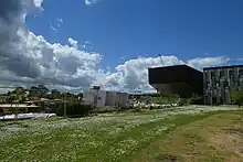 Part of a 400,000 sqf addition to Campus East consisting of 1,480 beds and costing £130 million, David Kato College along with Anne Lister College form a new student accommodation centre.[6] David Kato consists of 9 blocks arranged over 3 to 4 floors with a central community Hub containing study spaces, a laundry room, and social spaces.[7] The design focuses on modern design principles and sustainability but also borrows some architectural elements from existing buildings on campus such as the university's iconic 1960s covered walkways.[6]