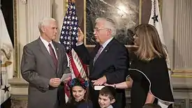 On March 29, Vice President Mike Pence officially administered the oath of office, swearing in Friedman.[54] He succeeded Leslie Tsou, who served as the interim chargé d'affaires after Daniel Shapiro left the position on January 20.[55][56]