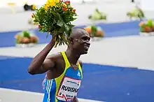 David Lekuta Rudisha, MBS (born 17 December 1988)[3] is a Kenyan middle-distance runner who specialized in the 800 metres. He is a two-time back-to-back Olympic champion from the 2012 London and 2016 Rio Olympics, a two-time World champion from the 2011 and 2015 World Championships in Athletics, and world record holder at the event with a time of 1:40.91, set at the 2012 London Games on 9 August 2012.[4][5] Rudisha is the first and only person to ever run 800 metres under 1:41, and he holds the three fastest, six of the eight fastest, and half of the twenty fastest times ever run in this event.[6]