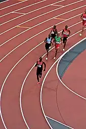 On 9 August 2012 at the 2012 Summer Olympics in London, Rudisha led from start to finish to win gold in what was acclaimed "The Greatest 800 Meter Race Ever".[16] In so doing, he became the first and, so far, only runner to break the 1:41 barrier for 800 m.[17] From the start of the final race, Rudisha led and pulled away from the rest of the field after 200 metres, completing the first lap in 49.28 seconds. By 600 metres his lead had grown to several metres. He continued to pull away until the final straight, where second place Nijel Amos was able to slightly gain some ground as Rudisha strained. But the gap was much too great to close, and Rudisha crossed the line in a world-record time of 1:40.91.