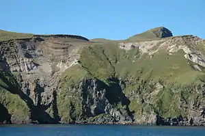 Davidof island is believed to be part of a circular complex of island remnants of an ancient twin-coned volcano that was destroyed in a catastrophic eruption during the late Tertiary period — Davidof, and its smaller companions Lopy and Pyramid Islands, are remnants of the ancient caldera rim while Khvostof Island is a remnant of the western portion of the cone. Davidof Island has steep rocky shores that rise to an interior plateau to a maximum elevation of 328 m). Much of its coastline comprises steep slopes or beaches of boulder and pebbles while Crater Bay coast on the southwest contains sandy beach.[3]