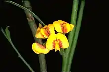 Daviesia discolor is a species of flowering plant in the family Fabaceae and is endemic to Queensland. It is a glabrous, multi-stemmed shrub with linear, more or less sickle-shaped phyllodes, and yellow and dark red flowers.