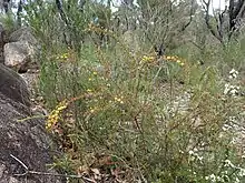 This species of pea mainly grows in sandy soil, usually derived from granite, in open forest with a scrubby understorey. It mainly occurs on the Northern Tablelands of New South Wales.[2][3]