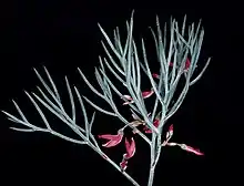 Daviesia speciosa is an erect, spindly, glabrous shrub that typically grows to a height of up to 30–80 cm (12–31 in) and has many erect stems. Its phyllodes are tapering needle-shaped, almost indistinguishable from the branchlets and sharply pointed, 15–80 mm (0.59–3.15 in) long and about 2 mm (0.079 in) wide. The flowers are arranged singly or in pairs in leaf axils on a peduncle 3–4 mm (0.12–0.16 in) long, the rachis 2–6 mm (0.079–0.236 in) long, each flower on a thread-like pedicel 5–15 mm (0.20–0.59 in) long with linear bracts 8–10 mm (0.31–0.39 in) long at the base. The sepals are about 8–11 mm (0.31–0.43 in) long and joined at the base, the five lobes about 2 mm (0.079 in) long. The flowers are red, and apparently bird-pollinated, the standard petal egg-shaped, turned back through a small angle, about 20–23 mm (0.79–0.91 in) long and 15–17 mm (0.59–0.67 in) wide. The wings are 20–22 mm (0.79–0.87 in) long, and the keel 23–25 mm (0.91–0.98 in) long. Flowering occurs in April and May.[2][3]
