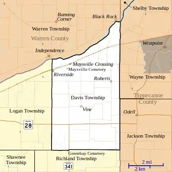 According to the 2010 census, the township has a total area of 23.71 square miles (61.4 km2), of which 23.54 square miles (61.0 km2) (or 99.28%) is land and 0.17 square miles (0.44 km2) (or 0.72%) is water.[3] It contains no incorporated settlements but four unincorporated ones. Both Maysville Crossing and Riverside lie in the northwest part of the township along the Norfolk Southern Railway line; Riverside is across the Wabash River from Independence in neighboring Warren County. Roberts is in the eastern part of the township, and Vine is near the center. There is a naturally occurring hollow in the Township known as Possum Holler. It's a ready-made weather break for those who live there and a lovely drive for those passing through. The area is rich in a wide variety of indigenous flora and fauna. Many locals refuse to live anywhere else calling the Holler home for generations