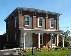 The Dawley House is a two-story brick structure built on a stone foundation. It is a variation on the vernacular Italianate style.[3] The bricks used in the construction were manufactured locally.[2] The main facade of the house is three bays wide and four along the side elevations. The bays are separated by Flat brick pilasters that have narrow caps just below the cornice level. The house is capped by a shallow hipped roof with narrow eaves with paired brackets. The main entrance is located off-center to the left. The porch, which extends across the front of the facade, and is probably of a later construction.[3] It is influenced by the Gothic Revival style and features thick chamfered posts. The windows are six over six sashes with flat lintels and sills. Built onto the rear of the house is a single-story kitchen wing. Like the main house block, it is capped with a bracketed hip roof and a wooden cornice. The small porch on the south side of the kitchen wing is supported by attenuated columns. The lot on which the house is built slopes steeply to the east. It features a stone retaining wall extends across its south side.