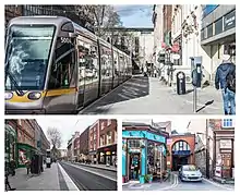 Dawson Luas stop is on the Luas Cross City extension. The line links the Red and Green lines going from Broombridge in North Dublin (interchange with Irish Rail station) and St. Stephen's Green Green Line stop. Construction started in June 2013 with services beginning on 9 December 2017.[19][20]