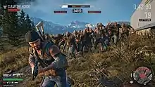 Days Gone is a third-person action-adventure game set in a post-apocalyptic open world. The player controls Deacon St. John, an outlaw-turned-drifter-bounty-hunter who prefers life on the road to wilderness encampments.[1] The game takes place two years after a pandemic killed almost all of humanity and transformed millions of others into "Freakers", mindless, zombie-like creatures that evolve quickly. Swarmers, a nocturnal type of Freaker, hide in their nests during daytime but often congregate, wander around, and search for food and water at night. Players can lure Swarmers toward other enemies, causing the two groups to fight one another.[2] Other enemies include Newts, who are infected adolescents and opportunistic hunters who only attack Deacon when he enters their territory or has poor health.[3] The game includes infected wildlife (called Runners and Ragers) and hostile human enemies.[2] Players can be overwhelmed by hordes and must keep their distance.[4] Deacon can use firearms, melee weapons, traps, explosives and choke points to kill Freakers.[5]