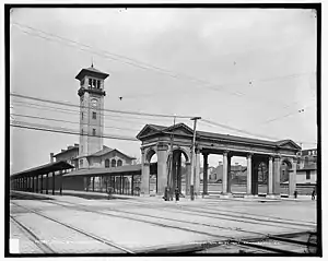 Colloquially called the "Tower Depot," it included a seven-story clock tower.[2][3] In the first 30 years of operation, the station hosted as many as 66 passenger trains a day. In 1931 the station opened an elevated platform to alleviate congestion between trains, streetcars and automobiles.[2]