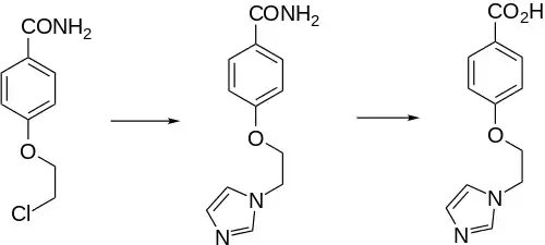 One convenient synthesis starts with the O-chloroethyl ether of p-hydroxybenzamide and proceeds bydisplacement with imidazole to give 2. Hydrolysis of the amide function completes the synthesis of dazoxiben.