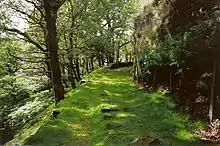 The quiet station at Dduallt was first mentioned as a passenger station in 1880. It was established as a signalling block post in 1884 on the closure of Tunnel South Signal Box.[1] It then declined steadily becoming an unstaffed halt in the 1930s (when it was landscaped by Clough Williams-Ellis who 40 years later advised on further landscaping) until final closure to passengers on 15 September 1939. Dduallt reopened to passenger trains on 6 April 1968, although passengers could not alight at the station for another few weeks because of continuing building work. The original slate water tank was recommissioned in May 1969 as an emergency supply and later a water supply was provided at the station, which was the upper terminus until 8 July 1977.