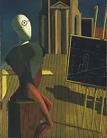 In the early 1920s, the Surrealist writer André Breton discovered one of de Chirico's metaphysical paintings on display in Guillaume's Paris gallery, and was enthralled.[21] Numerous young artists who were similarly affected by de Chirico's imagery became the core of the Paris Surrealist group centered around Breton. In 1924 de Chirico visited Paris and was accepted into the group, although the surrealists were severely critical of his post-metaphysical work.[22]