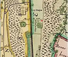 On this 1687 map, the Manpad is the main east-west route connecting Vogelenzang to Heemstede. This little map is a detail of a larger map showing the entire route of the Leidsevaart from Leiden to Haarlem (this is the black vertical double line in the middle). This piece of the old Manpad is the only piece with that name on the map. To the right of the Herenweg the Manpad continues east through what is now Groenendaal park towards the old center of Heemstede and the Haarlem lake (Haarlemmermeer). This footpath in the park still exists, though the east side of the park has changed quite a bit since the Haarlemmermeer was pumped dry in 1853.