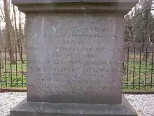 De Naald is the name the locals have given the monument. The 'needle' has often been mistaken for the border mark between Heemstede and Bennebroek, but in fact the border is further south. nl:David Jacob van Lennep (classicus), who lived in the 'Huis te Manpad' behind the monument, was a Dutch poet and professor of classical languages in Amsterdam. His son, Jacob van Lennep, who was 15 at the time of the monument's placement, later wrote a song commemorating 'Witte van Haemstede', one of the heroes mentioned on the monument. Later historians have questioned whether these events did in fact take place, and also whether the location is correct.[1] The Manpad was a generic name for the North-South route along the Dune ridge running from The Hague to Alkmaar. In most towns the road took on the name of Hoofdweg, the equivalent of 'Main Street'. This particular stretch of Manpad actually runs East-West, crossing the Leidsevaart from one sand ridge to another. The battles, if they took place, could have taken place anywhere along the Manpad. It is unlikely that Witte van Haemstede would reach Haarlem via the Manpad from Zandvoort, as the legend has it. The most direct route to Haarlem from Zandvoort is via the Visserspad.
