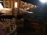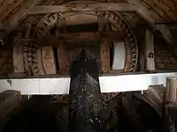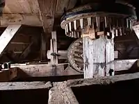 De Ropta is what the Dutch describe as a "stellingmolen". It is a smock mill on a two-storey base, there is a stage at second-floor level, 5.70 metres (18 ft 8 in) above ground level. The smock and cap are thatched. The mill is winded by tailpole and winch. The sails are Common sails. They have a span of 21.00 metres (68 ft 11 in).[3] The stocks are of interest in that one pair is of rivetted construction, made by the Gorter shipyard of Hoogezand, Groningen. The other stock, of welded construction, is claimed to be the first made by the millwright Christiaan Bremer of Adorp, Groningen.[1] The sails are carried on a cast-iron windshaft, which was cast in 1891 by De Prins van Oranje of The Hague, South Holland. The windshaft also carries the brake wheel, which has 61 cogs. This drives the wallower (32 cogs) at the top of the upright shaft. At the bottom of the upright shaft, the great spur wheel, which has 95 cogs. The great spur wheel drives two pairs of millstones via a lantern pinion stone nut which have 24 staves each. The millstones are 1.40 metres (4 ft 7 in) and 1.50 metres (4 ft 11 in) diameter, although one of the former is broken. The mill also drives two pairs of 1.70 metres (5 ft 7 in) diameter millstones which are used for milling pearl barley. These are driven by lantern pinion wallowers which have 20 staves each.[3]