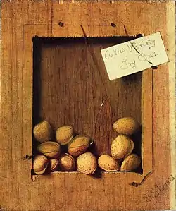 During his life, he was mainly known for his genre paintings and portraits of stylish young women in rich settings.[1] His popularity faded after his death, until a number of trompe-l'œil still lifes were attributed to him.[1] Evans is known to have signed his work as D. Scott Evans and later De Scott Evans, and some of the still lifes attributed to him bear the names David Scott, S. S. David, and Stanley S. David. The attributions are not without question, but are assumed based on the similarity of two paintings of pears, and scholars' inability to identify another artist named "David" who was active at the right time and place.[1]