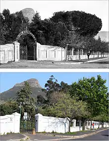 Two gates with brick piers and wrought-iron arches in Art Nouveau style at the lower corners[3] and a wall along Camp Street were built in 1899 and the wall was extended up Upper Orange Street in 1900. Molteno Road was extended down to meet Camp Street at about this time and it was decided to fence off the park on that side by planting a hedge of Kei apple.