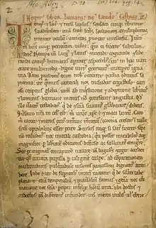 De laude Cestrie ("On the Glory of Chester"[1]), also known as Liber Luciani de laude Cestrie ("The Book of Lucian in Praise of Chester"[2][nb 1]), is a medieval English manuscript in Latin by Lucian of Chester, probably a monk at the Benedictine Abbey of St Werburgh in Chester. Believed to date from the end of the 12th century, it has been described as "the oldest extant piece of Cheshire writing,"[2] and, with its first-hand description of the medieval town of Chester, is one of the earliest examples of prose writing about an English urban centre. It is also notable for the earliest extended description of Chester's county palatine status, which Lucian writes "gives heed ... more to the sword of its prince than to the crown of the king."[4] The original manuscript is held by the Bodleian Library, Oxford. Excerpts have been published in 1600, 1912 and 2008.