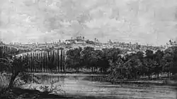 Bucharest at the beginning of the 19th century. Dealul Mitropoliei is in the centre of the drawing; Curtea Arsă to the left and Radu Vodă Monastery to the right (drawing by R. Bielitz)