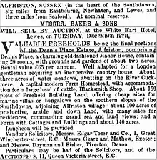Dean's Place was again advertised for sale in 1871[11] and 1878[12] By about 1882 William Reynold Gade appears to be the owner of the property.[13] He was married to Isabelle Julie Daelman and she inherited the house when he died. In 1893 she decided to sell the whole estate and a major sale was held. The property was subdivided into many lots and they were sold separately. The first sale was in June 1893 and was preceded by a sumptuous champagne luncheon.[14] Dean's Place was advertised again in December 1893 and bought by Charles Goble Champion,[15] a solicitor, who also owned property in Eastbourne. After his death the house was bought by General Sir Herbert Lawrence.