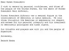 The living former presidents of Argentina sent their condolences for Alfonsín. Carlos Menem said that his death was a great loss for democracy.[19] He also wrote an editorial for the La Nación newspaper, titled "Un viejo adversario saluda a un amigo" (Spanish: An old adversary salutes a friend), mirroring the famous quotation of the radical leader Ricardo Balbín during the funeral of Perón.[20] Fernando de la Rúa said that "he fought all his life for politics and democracy. He raised up the values of democracy. Respect and affection were always present in him".[19] Eduardo Duhalde described him as a family friend,[19] and said Argentina lost a great man.[21] Néstor Kirchner praised the trial of the Juntas.[19] He also received condolences of José Sarney, Patricio Aylwin and Julio María Sanguinetti, contemporary presidents of Brazil, Chile and Uruguay.[22] The governments of Brazil, Chile, Colombia, France, Mexico, Paraguay, Peru, Spain, United States and Uruguay also sent messages of condolences.[23]