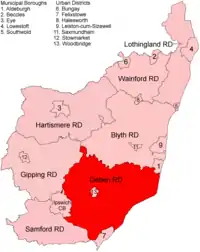 Deben Rural District was a rural district in the county of East Suffolk, England. It was created in 1934 by the merger of parts of the disbanded Bosmere and Claydon Rural District, the disbanded Plomesgate Rural District and the disbanded Woodbridge Rural District, under a County Review Order.[1] It was named after the River Deben and administered from Woodbridge.