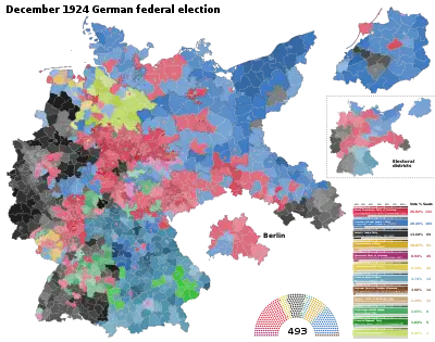 Snap federal elections were held in Germany on 7 December 1924,[1][2] the second that year after the Reichstag had been dissolved on 20 October. The Social Democratic Party remained the largest party in the Reichstag, receiving an increased share of the vote and winning 131 of the 493 seats.[3] Voter turnout was 78.8%.[4]