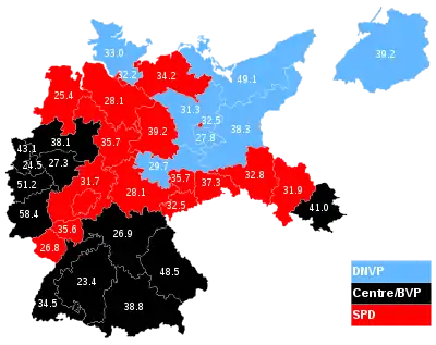 The National Socialist Freedom Movement received 6.5% in the previous election, but party unity broke down afterwards. Julius Streicher and Hermann Esser left to form their own party while Adalbert Volck and Ludolf Haase advocated abstaining from the election or voting for other nationalist parties.[5] The NSFM was attacked as anti-Catholic by the Centre Party and anti-Christian by the German National People's Party (DNVP).[6]