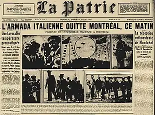 - ↑ Russel, Owen (July 15, 1933). "BALBO IN MONTREAL; OFF TO GOAL TODAY; Italian Planes to Start for Chicago at 10 A.M. -- Premier Praises Fliers. ARMY PLANS AN ESCORT 21 Military Machines to Meet Armada -- Arrival at Exposition Will Be Broadcast. BALBO AND ARMADA REACH MONTREAL CANADA WELCOMES CHIEF OF ITALIAN AIR FLEET". The New York Times: 1. ISSN 0362-4331.