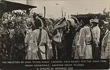 In Chicago, a crowd of more than 100,000 gathered to cheer the arrival of Balbo's fleet on the evening of July 15. During dinner at the Stevens Hotel, former judge John Sbarbaro read a message from President of the United States Franklin D. Roosevelt. Speakers at the event included the Governor of Illinois Henry Horner, Mayor Kelly, and the president of Century of Progress Rufus C. Dawes. Leaflets attacking Balbo signed by the Italian Socialist Federation circulated around the fair area.[2] The arrival of the Italians and Balbo's speeches were broadcast by The National Broadcasting Company. Loyola University Chicago awarded Balbo an honorary degree, July 15 was proclaimed Italo Balbo Day and on July 17 Chicago's Seventh Street was renamed Balbo Avenue. Balbo received a gold key to the city from Mayor Kelly.[42][43] United States Commissioner to the Century of Progress Exposition Harry Stewart New said that if Balbo remained in the US he might be elected president. In a ceremony that Balbo found particularly strange, he was initiated into the Sioux tribe as "Chief Flying Eagle". Being very cautious about his public image, Balbo was unsure whether to accept, and agreed only after hearing that former US President Calvin Coolidge also received such an honor.[44]