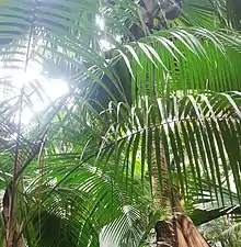 This species of palm tree has a distinctive spiny fruit, and produces yellow spines on the trunks of young specimens. Adults reach a height of 40 meters.