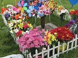 According to the Mitchell County Historical Society, "[f]resh flowers were used in earlier times and are considered the best. Homemade crepe paper flowers were later used, and now artificial flowers are mainly used for decorating. Flowers can be placed on graves in any number of ways, including creating attractive patterns."[13] Floral wreaths are common in both Appalachian and Liberian grave decoration.[14]