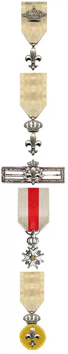 As with the croix du Lys, some bore the inscription Gage de la paix- Vive le Roi. These bars were sometimes borne on the ribbon of the Légion d'Honneur.