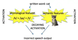 The "connectionist model" suggests that the phonological and semantic features of a word are activated, but this activation decays at a rate too quick for cognitive processing- thus, errors in speech output are produced as a result of this fading activation.[2][3] This hypothesis explains the broad symptom-complex of deep dyslexics without resorting to a multiple loci damage approach as seen in other models.[2][3] It eliminates the need to attribute a specific locus of damage to each symptom of deep dyslexia, and instead states that all symptoms are due to decay of a large activation area.[2][3]