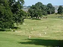 Deer parks could vary in size from a circumference of many miles down to what amounted to little more than a deer paddock.[21] The landscape within a deer park was manipulated to produce a habitat that was both suitable for the deer and also provided space for hunting. "Tree dotted lawns, tree clumps and compact woods"[22] provided "launds" (pasture)[23] over which the deer were hunted and wooded cover for the deer to avoid human contact. The landscape was intended to be visually attractive as well as functional.