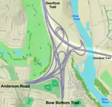 - ↑ Google (27 October 2016). "Deerfoot Trail at Anderson Road and Bow Bottom Trail" (Map). Google Maps. Google. Retrieved 27 October 2016.