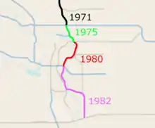 The province took over responsibility from the City of Calgary in 2000 to upgrade the route to a freeway and render the CANAMEX Corridor a contiguous route through the city, after which they intended to return the road to the city.[64][65] In 2003, a $100 million extension was completed extending Deerfoot Trail from its junction with Highway 22X to its present terminus near De Winton.[47] During planning, the segment had been temporarily designated as Highway 2X.[66] Prior to the 10-kilometre (6.2 mi) project, Deerfoot was effectively disconnected from the rest of Highway 2.[67] Traffic continuing south to Fort Macleod proceeded west on a two lane bridge carrying Highway 22X over the Bow River, before turning south onto Macleod Trail, which was then designated as Highway 2.[62] The section of Highway 22X over the river became Stoney Trail (Highway 201) in 2013,[46] and a second bridge was completed in 2007 to carry the westbound lanes, while the original bridge built in 1974 carries the eastbound lanes.[16]: 109