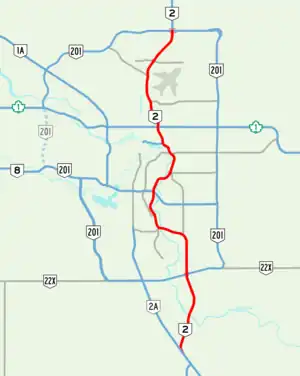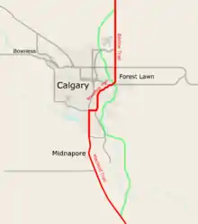 As a segment of Highway 2, Deerfoot Trail is a core route of the National Highway System and a key international corridor.[3] It is also part of Calgary's Primary Goods Movement Network and is identified as a skeletal road in the city's Transportation Plan, a limited-access route important for long distance travellers, and is the only route that stretches the entire length of the city from north to south.[4] From its split with Highway 2A (Macleod Trail) near the hamlet of De Winton in the south, it runs north to Stoney Trail at Calgary's northern city limit where it becomes the Queen Elizabeth II Highway.[5][6] The freeway roughly bisects the city, though it lies entirely east of Centre Street which officially marks the boundary between the east and west side of the city. From its southern terminus until Memorial Drive, Deerfoot approximates the course of the Bow River. Initially the freeway is on the east side, then crosses to the west bank, and finally back to the east before the river and Memorial Drive veer west at Inglewood towards downtown.[7] Most of the road's northern half parallels Nose Creek, a tributary of the Bow.[8]