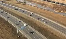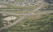 The freeway features 21 interchanges of varying design.[5] The most recent interchanges to be constructed at the north and south ends of the freeway are more consistently of the partial cloverleaf type, a design highly used in Alberta as it is a desirable compromise between cost and capacity. The two interchanges with Stoney Trail are cloverstack interchanges, where high capacity directional flyovers carry traffic turning left for movements with more traffic, and loop ramps service lesser used left turn movements.[41][42] Older and less efficient designs are used at Deerfoot's intersections with both Glenmore Trail and Highway 1. The junction with Glenmore is an incomplete cloverleaf interchange; traffic northbound on Deerfoot does not have direct access to westbound Glenmore and one must first exit to the east, proceed through a traffic light behind Calgary Auto Mall, and enter Glenmore Trail from the north side.[7] At Highway 1, a split diamond interchange significantly slows east-west traffic even outside of peak hours, because all left turn movements must pass through three sets of traffic lights.[43] This outdated interchange was Calgary's most dangerous road junction in 2011, with 234 crashes recorded.[14]