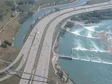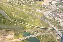 Immediately after the river, Deerfoot merges with the major routes of Anderson Road and Bow Bottom Trail, often a point of congestion at rush hour. In both directions, traffic through the outdated interchange is reduced from three lanes to two.[20] The freeway curves north along the river's west bank to cross Southland Drive, paralleling Blackfoot Trail near the community of Acadia.[7] North of Acadia, the freeway bisects a large area of commercial development for several kilometres before reaching a major interchange at Glenmore Trail.[21] The interchange is generally identified as the second of two major congestion points on Deerfoot in south Calgary, the so called "Glenmore squeeze", where traffic is reduced to two lanes each way over Glenmore.[22] Deerfoot turns sharply to the east and again crosses the Bow River on the Calf Robe Bridge, named after a Siksika Nation elder.[14] Veering back to the north, it follows the river's east bank across Peigan Trail to a partial cloverleaf interchange at 17 Avenue SE, passing the neighbourhoods of Dover and Southview. Deerfoot meets Memorial Drive, a major freeway spur into downtown, near Pearce Estate Wetland, Wilder Institute/Calgary Zoo and the Max Bell Centre, and continues into north Calgary while the Bow River turns west towards downtown.[7][23]